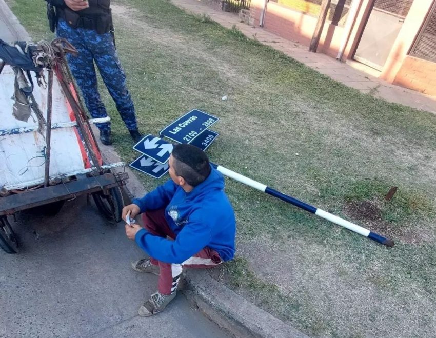 Ayer por la tarde, policías del Grim 5 vieron a un hombre de 31 años que llevaba consigo un cartel de señalización de calles.