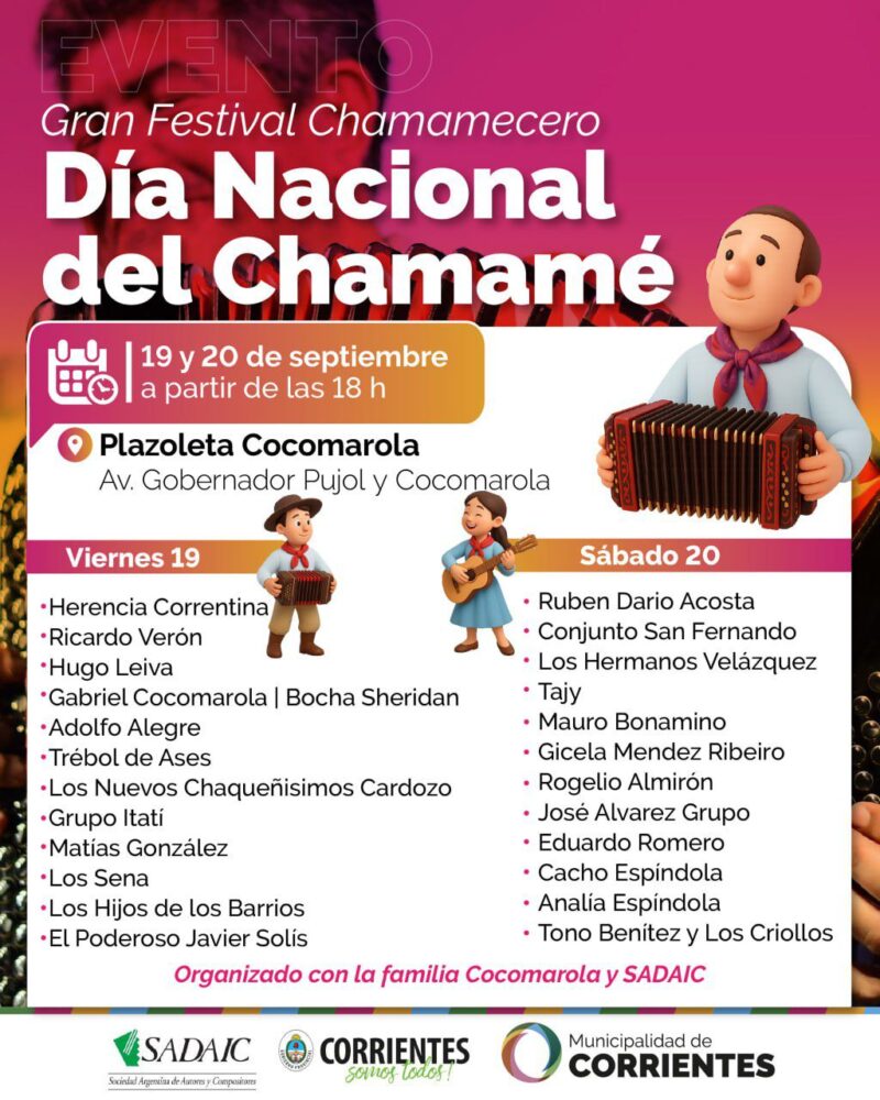 Impulsado por la Municipalidad de Corrientes, durante dos días, hoy y mañana, desde las 18 en la Plazoleta Cocomarola (Av. Gobernador Pujol y Cocomarola) se llevará adelante un gran festival por el “Día Nacional del Chamamé”, con shows en vivo a cargo de artistas y elencos locales.