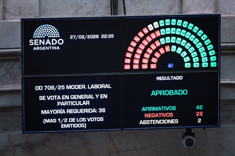 Tras haber sancionado previamente la nueva ley penal juvenil, ya avanzada la noche, el Senado aprobó la reforma laboral. Luego de que el proyecto volviera a la Cámara de origen por modificaciones técnicas, el oficialismo obtuvo la aprobación definitiva con un total de 42 votos a favor, mientras que 28 senadores se manifestaron en contra y se registraron dos abstenciones. Con esta decisión legislativa, la iniciativa quedó lista para que el Poder Ejecutivo oficialice su promulgación a través del Boletín Oficial, una comunicación institucional que se realizaría el próximo lunes.