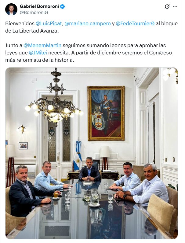 La confirmación llegó también a través del presidente del bloque libertario, el cordobés Gabriel Bornoroni, quien celebró la llegada del correntino y sus pares. «Junto a Martín Menem, seguimos sumando leones para aprobar las leyes que necesita el país. A partir de diciembre seremos el Congreso más reformista de la historia», aseguró en redes sociales.
