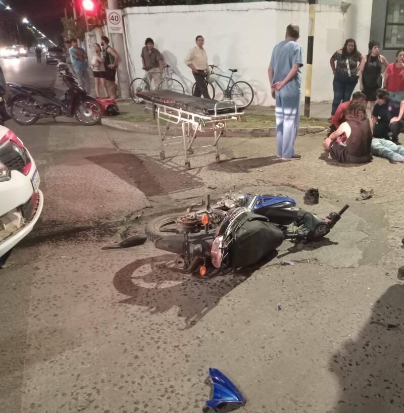 Un automóvil y una motocicleta protagonizaron un violento choque en el cruce de las avenidas Rolón y Mariano I. Loza en la ciudad de Goya, en la noche de este sábado 9. Los ocupantes de la motocicleta resultaron lesionados y trasladados al Hospital Regional Dr Camilo Muniagurria.