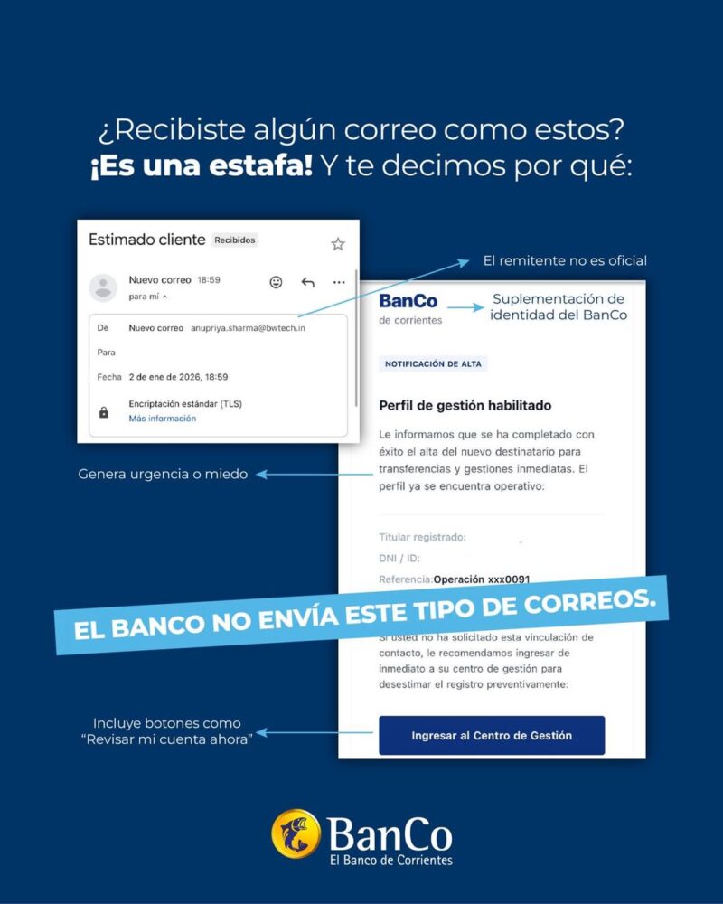 Desde el BanCo sostienen: «El Banco nunca te va a pedir información sensible por correo electrónico, llamadas o mensajes privados en redes». Tampoco se solicita la confirmación de operaciones a través de enlaces externos.