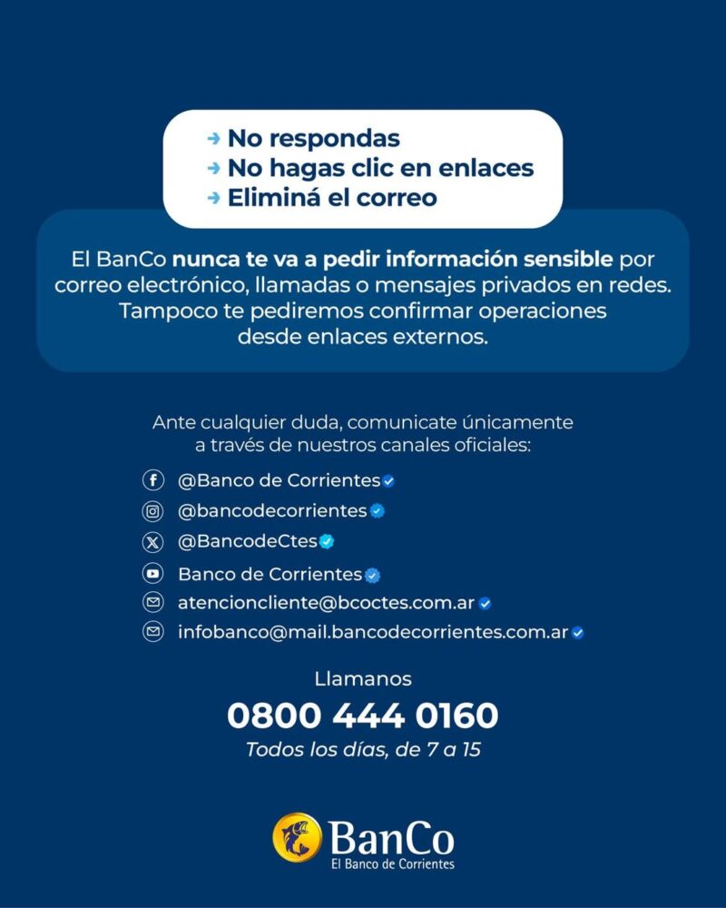 Para evitar caer en estafas, el Banco de Corrientes recuerda que ante cualquier duda se debe consultar únicamente a través de sus canales verificados (identificados con el tilde azul): Redes Sociales: @BancodeCorrientes (FB/IG) y @BancodeCtes (X). Correos Oficiales: [email protected] e [email protected]. Atención Telefónica: 0800-444-0160 (Todos los días, de 7 a 15 h).