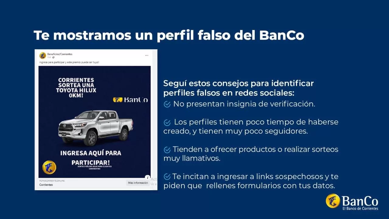 Ante la circulación en internet de campañas engañosas que involucran a entidades bancarias y sus clientes, el Banco de Corrientes (BanCo) difundió una serie de recomendaciones para prevenir y evitar situaciones fraudulentas o de estafas.