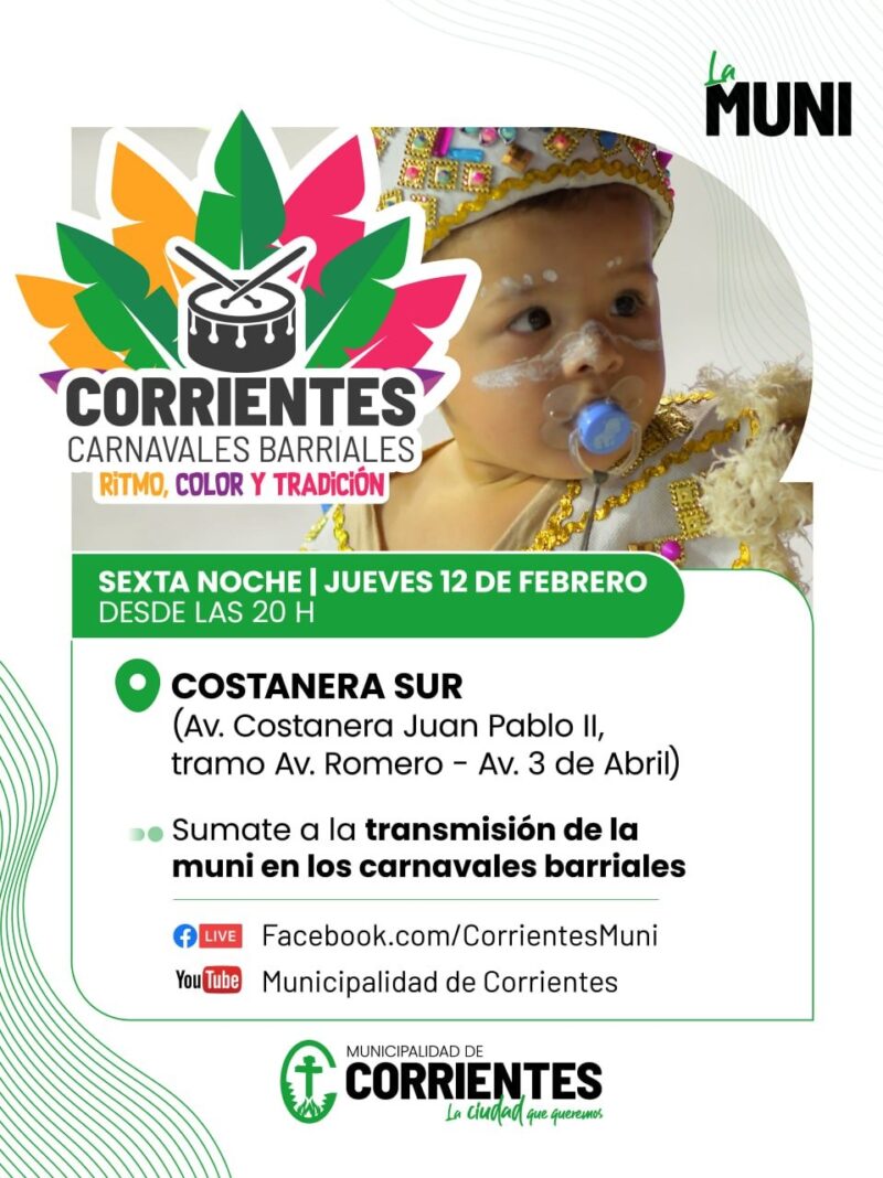 Para quienes no puedan acercarse, la sexta noche será transmitida en vivo a través de las redes oficiales de la Municipalidad de Corrientes: Facebook (CorrientesMuni) y Youtube (@municipalidaddecorrientes).
