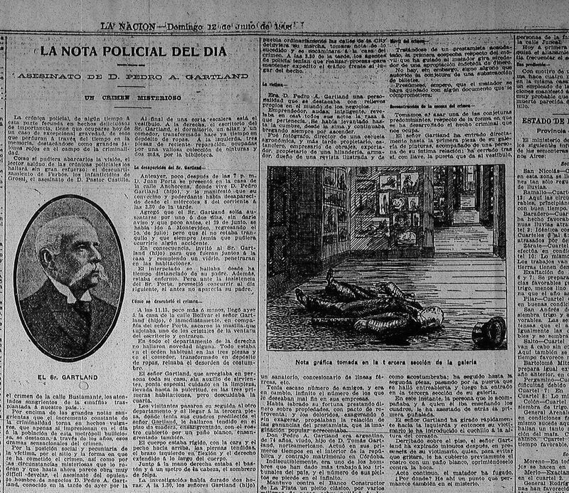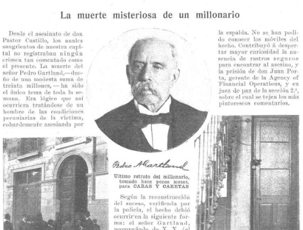 El crimen ocurrió en 1908 y causó un revuelo nacional. La víctima, Pedro Gartland, era uno de los hombres más ricos del país y el homicida actuó en complicidad con uno de sus socios. Estuvo prófugo varios años y cuando la Justicia creyó que se había esfumado, cayó por un descuido: se emborrachó y habló demás.