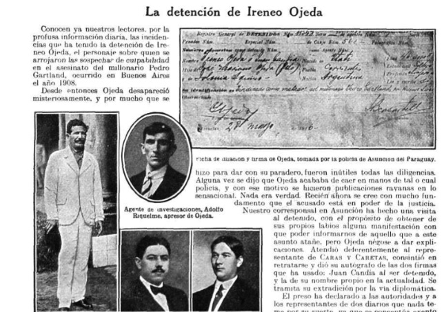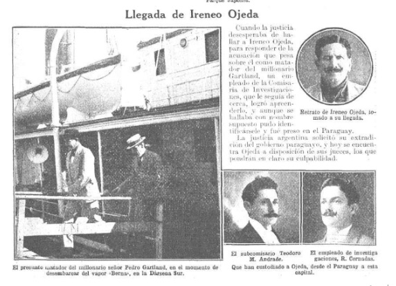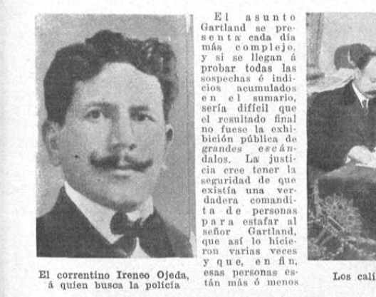 Corría julio de 1908 y un sangriento crimen sacudió a la opinión pública nacional. Pedro Gartland, unos de los hombres más adinerados del país fue asesinado en su casa de la ciudad de Buenos Aires. El caso fue investigado como un crimen mafioso y también como el resultado de la venganza de personas a quienes el millonario les prestaba dinero. Luego, los investigadores fueron atando cabos y así pudieron saber que todo fue producto de una traición y que el autor material fue un correntino al que contrataron como asesino a sueldo que logró escapar. Estuvo prófugo durante ocho años y cuando ya perdieron las esperanzas de atraparlo, se descuidó y fue detenido en Paraguay. Se llamaba Ireneo Ojeda y una copas demás evitaron que se saliera con la suya.