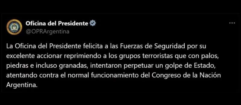 “La Oficina del Presidente facilita a las Fuerzas de Seguridad por su excelente accionar reprimiendo a los grupos terroristas que con palos, piedras e incluso granadas, intentaron perpetrar un golpe de Estado, atentando contra el normal funcionamiento del Congreso de la Nación Argentina”, expresó el comunicado publicado en la cuenta de X (ex Twitter) de Presidencia.