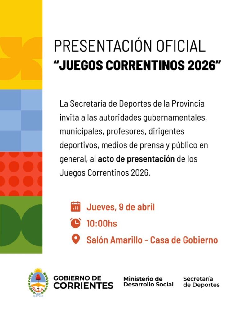 La Secretaría de Deportes de la Provincia, informó que este jueves 9 de abril, a las 10, en el Salón Amarillo de Casa de Gobierno, se realizará el acto de lanzamiento de los Juegos Correntinos 2026.