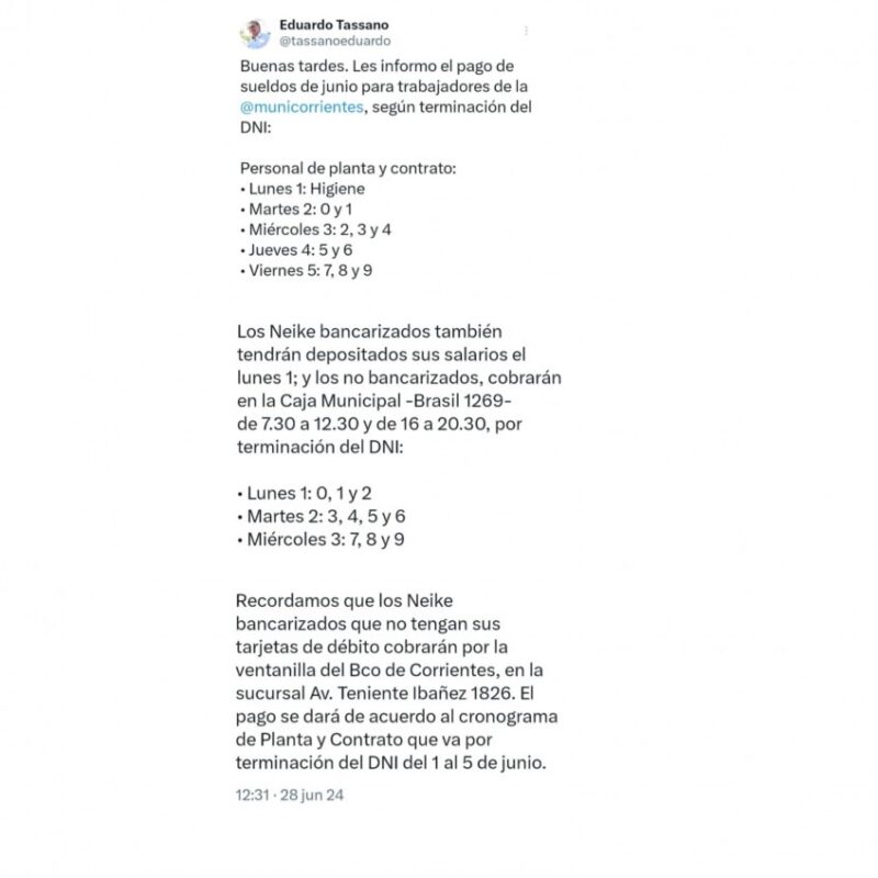 En tanto que Neike sin tarjeta de débito podrán cobrar en la sucursal del Banco de Corrientes de Teniente Ibáñez 1826. Este segmento de trabajadores se deberá regir por el cronograma de agentes de planta y contrato. Esto es, por terminación de DNI y del lunes 1 al viernes 5 como se detalló al principio.