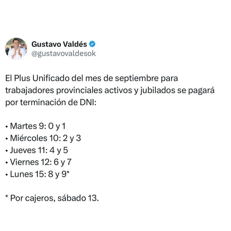 El Primer Mandatario de Corrientes confirmó que el primer tramo del pago del Adicional Remunerativo Mensual (Plus Unificado) de $110 mil por agente de la administración pública provincial, tanto activos, jubilados y pensionados, correspondientes a septiembre de 2015 se paga este martes 9.