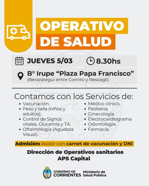 La Dirección de Operativos Sanitarios de APS Capital, dependiente del Gobierno de Corrientes, llevará adelante una jornada de asistencia médica territorial este jueves en el sector sur de la ciudad. La iniciativa busca facilitar el acceso a la salud pública y gratuita a los vecinos del barrio Irupé y zonas aledañas, concentrando múltiples especialidades en un solo punto de atención.