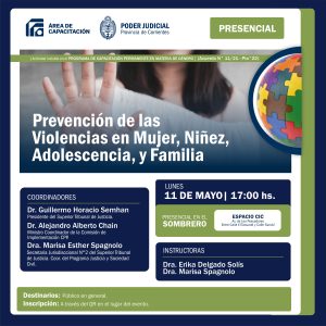 El Poder Judicial de la Provincia de Corrientes realizará una jornada presencial titulada “Prevención de las Violencias en Mujer, Niñez, Adolescencia y Familia”. El encuentro, que busca brindar herramientas de sensibilización y abordaje integral frente a estas problemáticas, tendrá lugar el próximo lunes 11 de mayo a las 17 en el Espacio CIC de la localidad de El Sombrero.