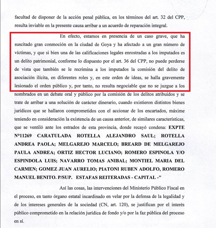 En el documento exclusivo que accedió EL LIBERTADOR, se expresa: “En efecto, estamos en presencia de un caso grave, que ha suscitado gran conmoción en la ciudad de Goya y ha afectado a un gran número de víctimas, y que si bien una de las calificaciones legales enrostradas a los imputados es un delito patrimonial, conforme lo dispuesto por el art. 36 del CPP, no puede perderse de vista que también se le recrimina a los imputados la comisión del delito de asociación ilícita, en diferentes roles y, en este orden de ideas, se halla gravemente lesionado el orden público y, por tanto, no resulta negociable que no se juzgue a los nombrados en un debate oral y público por la comisión de los delitos atribuidos y se trate de arribar a una solución de carácter dinerario, cuando existieron distintos bienes jurídicos que se hallaron comprometidos con el accionar de los encartados, máxime teniendo en consideración la existencia de un causa anterior, de similares características, que se ventiló ante los estrados de esta provincia, donde recayó condena:  Expte n°11269 caratulada Rotella Alejandro Saul; Rotella Andrea Paola; Melgarejo Marcelo; Breard de Melgarejo Paula Andrea; Ortiz Hector Luciano; Romero Espinola y/o Espindola Luis; Navarro Tomas Anibal; Montiel Maria del Carmen; Gomez Juan Aurelio; Piatoni Ruben Adolfo, Romero Manuel Benito. p/sup. estafas reiteradas – capital -«, en referencia al escándola de la causa Bostón.