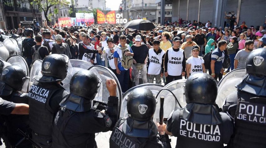 El Polo Obrero se movilizó hoy a la Plaza de Mayo en el estreno del Protocolo Antipiquetes impulsado la semana pasada por la ministra de Seguridad, Patricia Bullrich.