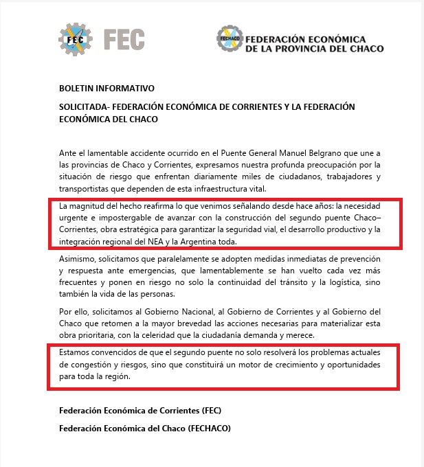 «La magnitud del hecho reafirma lo que venimos señalando desde hace años: la necesidad urgente e impostergable de avanzar con la construcción del segundo puente Chaco-Corrientes», sentenciaron las entidades en su boletín.
