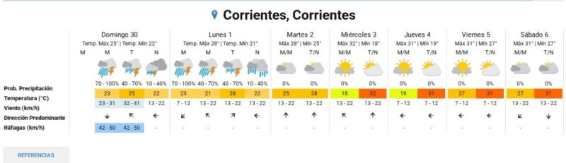 Para esta zona, el SMN anticipa: «El área será afectada por tormentas, algunas localmente fuertes. Las mismas podrán provocar lluvias abundantes en cortos periodos, frecuente actividad eléctrica, ocasional caída de granizo y ráfagas que pueden superar los 80 km/h de forma localizada.»