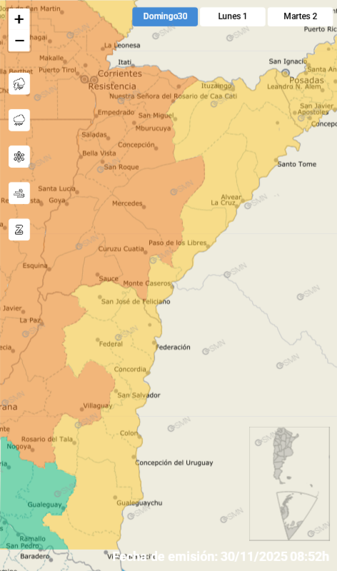 Esta advertencia se focaliza en el Norte correntino y la costa del río Uruguay, abarcando las siguientes localidades: Ituzaingó y San Miguel; Santo Tomé, La Cruz, Alvear, San Martín y Paso de los Libres