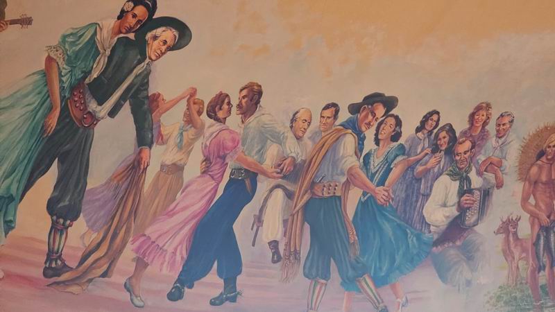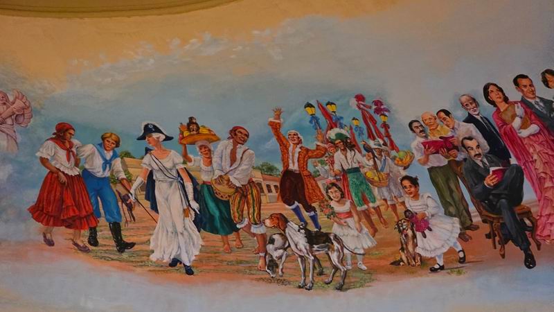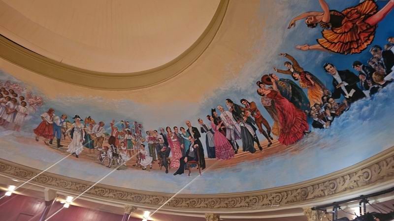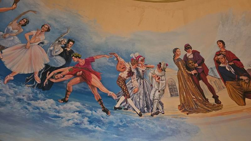 De acuerdo con la descripción, en su pintura se refleja: la comedia del arte con su farsa de enredos está representada por Colombina, arlequín con I Pagliacci; la danza clásica con escenas de los ballet que más se admiraron en Corrientes: Excelsior de Luigi Manzotti y Romualdo Marenco, retratada Matilde Vallarino en el rol de La luz; La noche de Walpurgis de la opera Fausto de Charles Gounod. Interpretando el pas de deux María Elena Bernich y el autor del fresco, José Antonio Ramírez, ex bailarín de Nity Cigersa, famosa coreógrafa italiana, ex bailarina del Teatro alla Scala di Milano, de la época de Enrico Cechetti.
