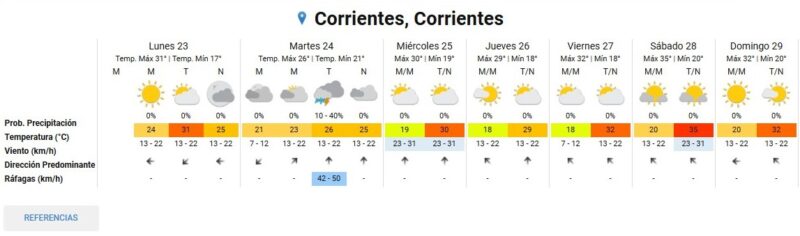 La Navidad este año se celebrará justo a mitad de semana y de acuerdo al SMN, en Corrientes el cielo estará algo nublado, lo que permitirá disfrutar de actividades al aire libre, como ir a la playa. La temperatura irá en ascenso. La máxima se prevé que alcanzará los 30 grados, mientras que la mínima será de 19 grados. El viento soplará del Sur, con rachas de entre 23 y 31 kilómetros por hora.