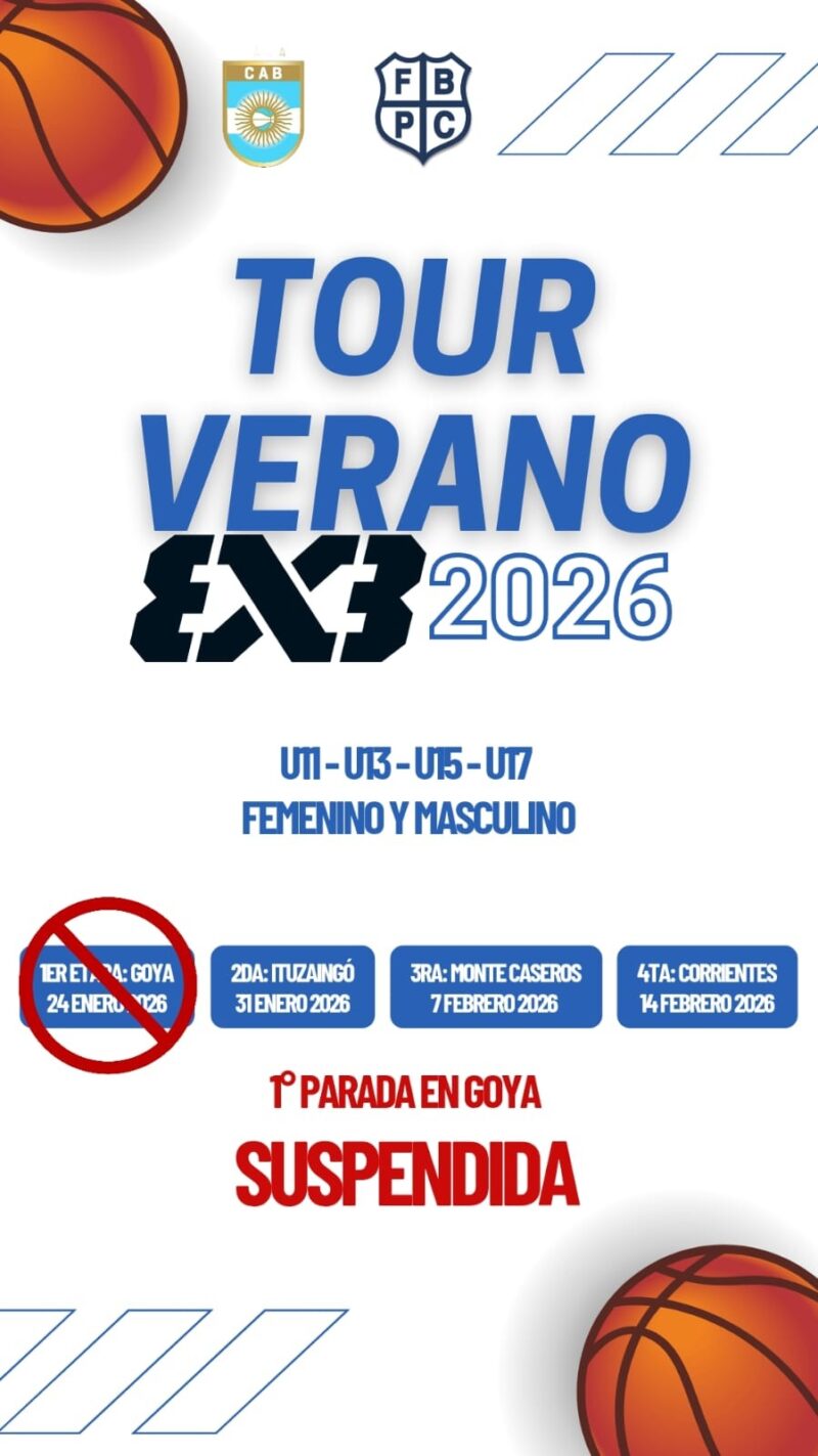 El Tour de Verano 3×3, organizado por la Federación de Básquet de la Provincia de Corrientes, informó que debió suspender la jornada prevista para este sábado 24 en la ciudad de Goya.