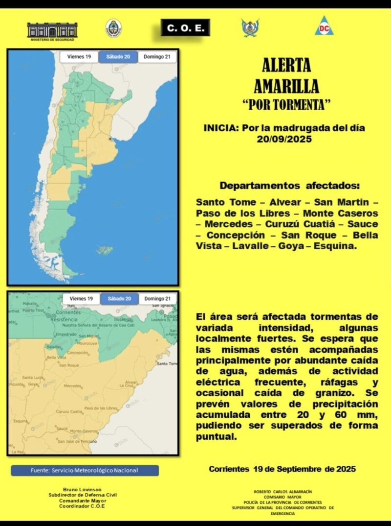 Según informaron, se espera que las tormentas, de variada intensidad y localmente fuertes, afecten a los departamentos de Santo Tomé, Alvear, San Martín, Paso de los Libres, Monte Caseros, Mercedes, Curuzú Cuatiá, Sauce, Concepción, San Roque, Bella Vista, Lavalle, Goya y Esquina.