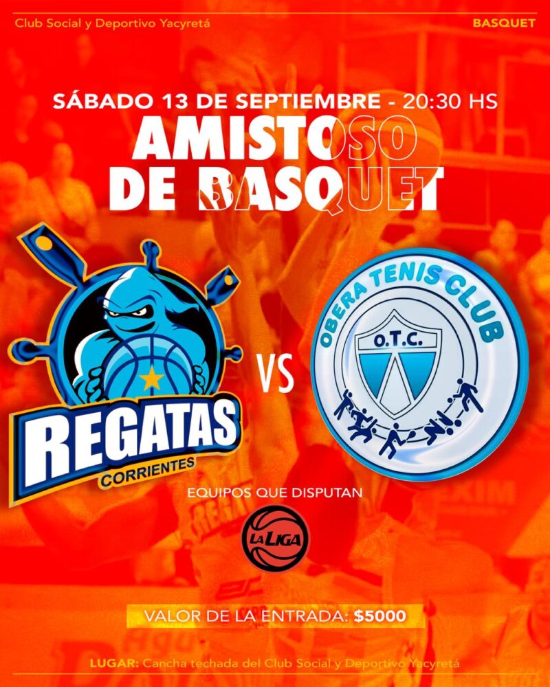 Regatas Corrientes confirmó su primer encuentro amistoso de pretemporada. Será este sábado 13 de septiembre a partir de las 20.30, enfrentando a Oberá Tenis Club (OTC) de Misiones, en las instalaciones del Club Yacyretá de la ciudad de Ituzaingó, ubicado en calles Pago Largo y Tranquera de Loreto.