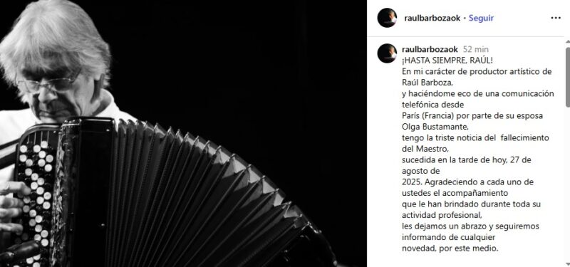 “En mi carácter de productor artístico de Raúl Barboza, y haciéndome eco de una comunicación telefónica desde París (Francia) por parte de su esposa Olga Bustamante, tengo la triste noticia del fallecimiento del Maestro, sucedida en la tarde de hoy, 27 de agosto de 2025”, dieron a conocer desde las cuentas oficiales del autor y compositor argentino.