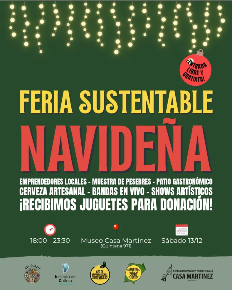 El 13 de diciembre la Feria Sustentable presentará su edición especial de Navidad, la última del año, en el Museo Casa Martínez de Corrientes, donde emprendedores y productores ofrecerán propuestas pensadas para las fiestas y el cierre de 2025. El evento se desarrollará de 18 a 23.30 y reunirá una variada oferta de productos sustentables, artesanales y de economía circular.