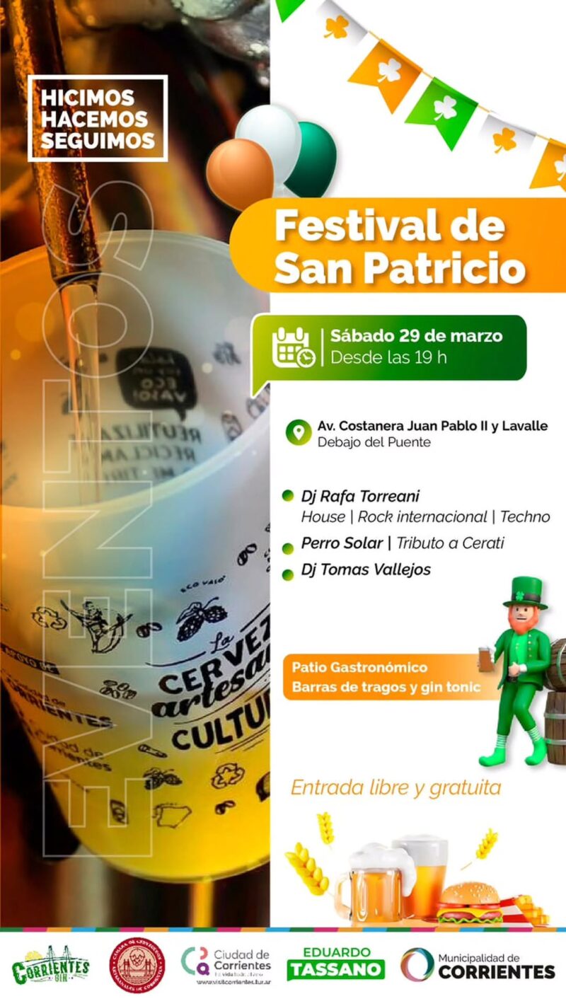 El Festival de San Patricio se realizó anoche entre las calles Lavalle y Costanera (debajo del puente) y hoy continúa a partir de las 19 con una amplia programación, más de 20 cervecerías artesanales, barra de tragos, patio gastronómico y shows en vivo.