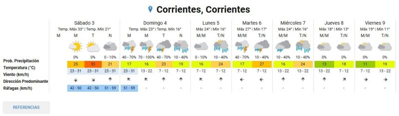 De acuerdo al pronóstico extendido, este domingo se registrarían tormentas y chaparrones en Corrientes Capital y sus alrededores desde la madrugada. Se estima una temperatura mínima de 16ºC y máxima de 23ºC.