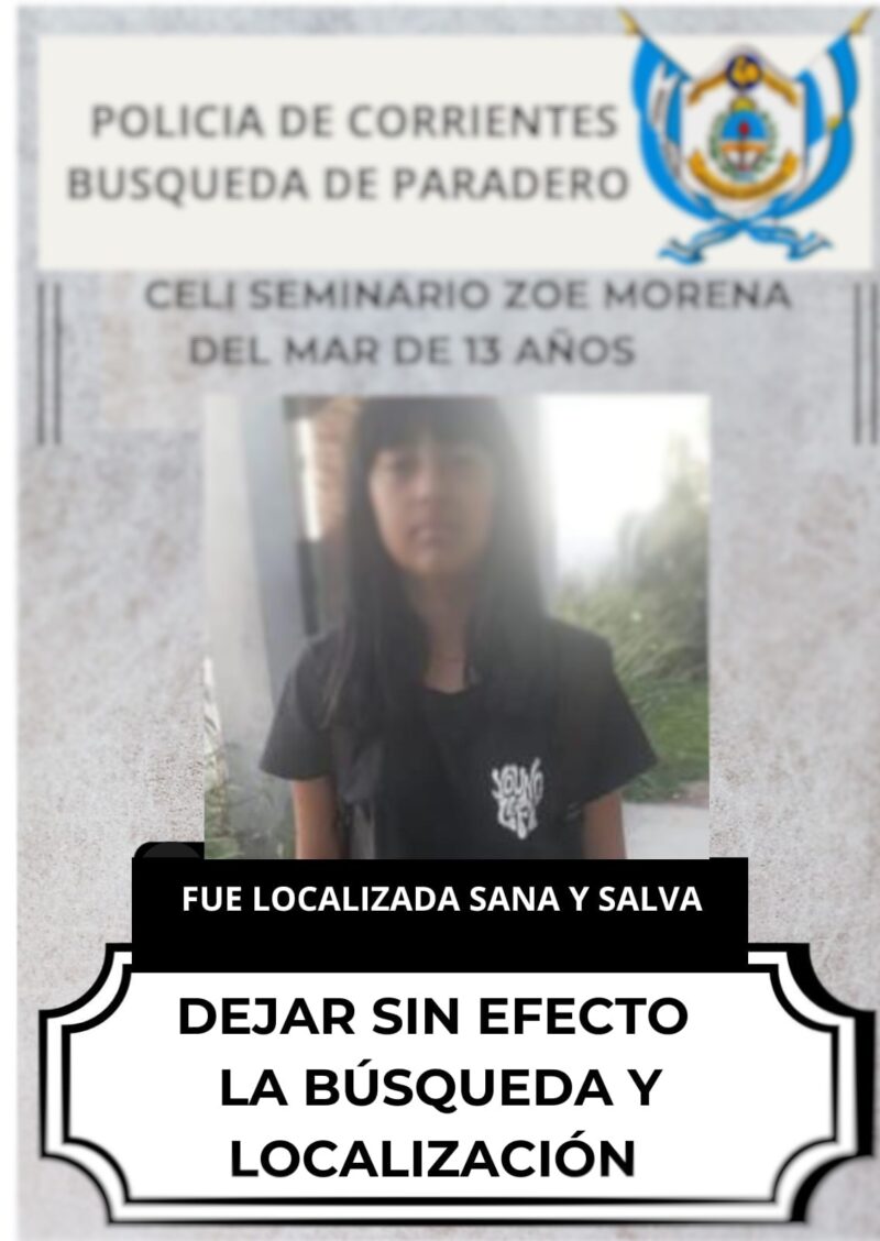 Tras varios días de incertidumbre, culminó exitosamente el operativo de búsqueda y localización de la niña Celi Seminario Z M M (13). Fuentes de la Policía de Corrientes confirmaron que la adolescente fue hallada sana y salva en el ámbito de la Capital.