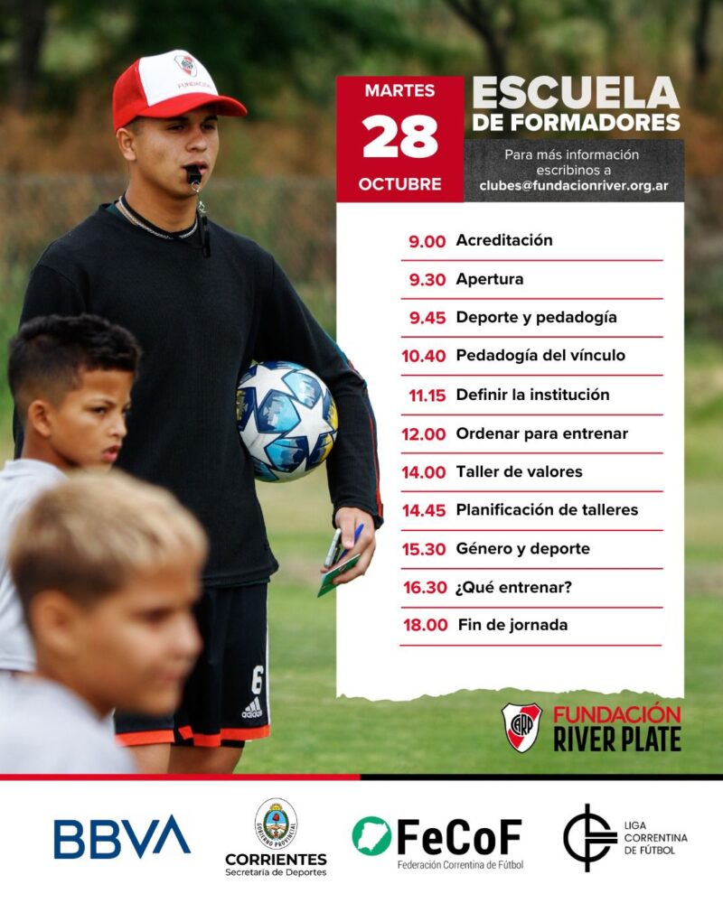 Este martes 28 y miércoles 29 la Fundación River Plate llegará a la ciudad de Corrientes con la “Escuela de Formadores”. Llevarán adelante una capacitación integral para líderes deportivos y sociales de todas las disciplinas deportivas.