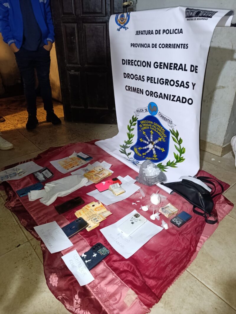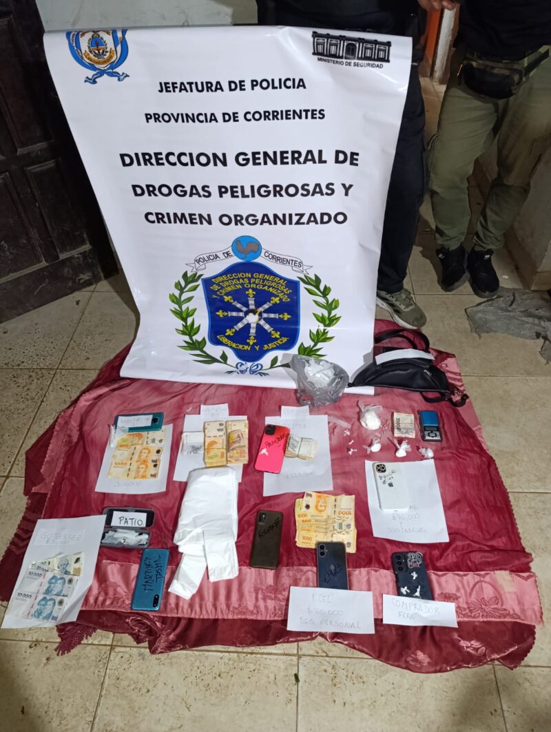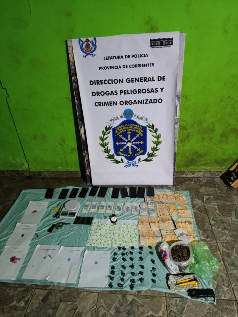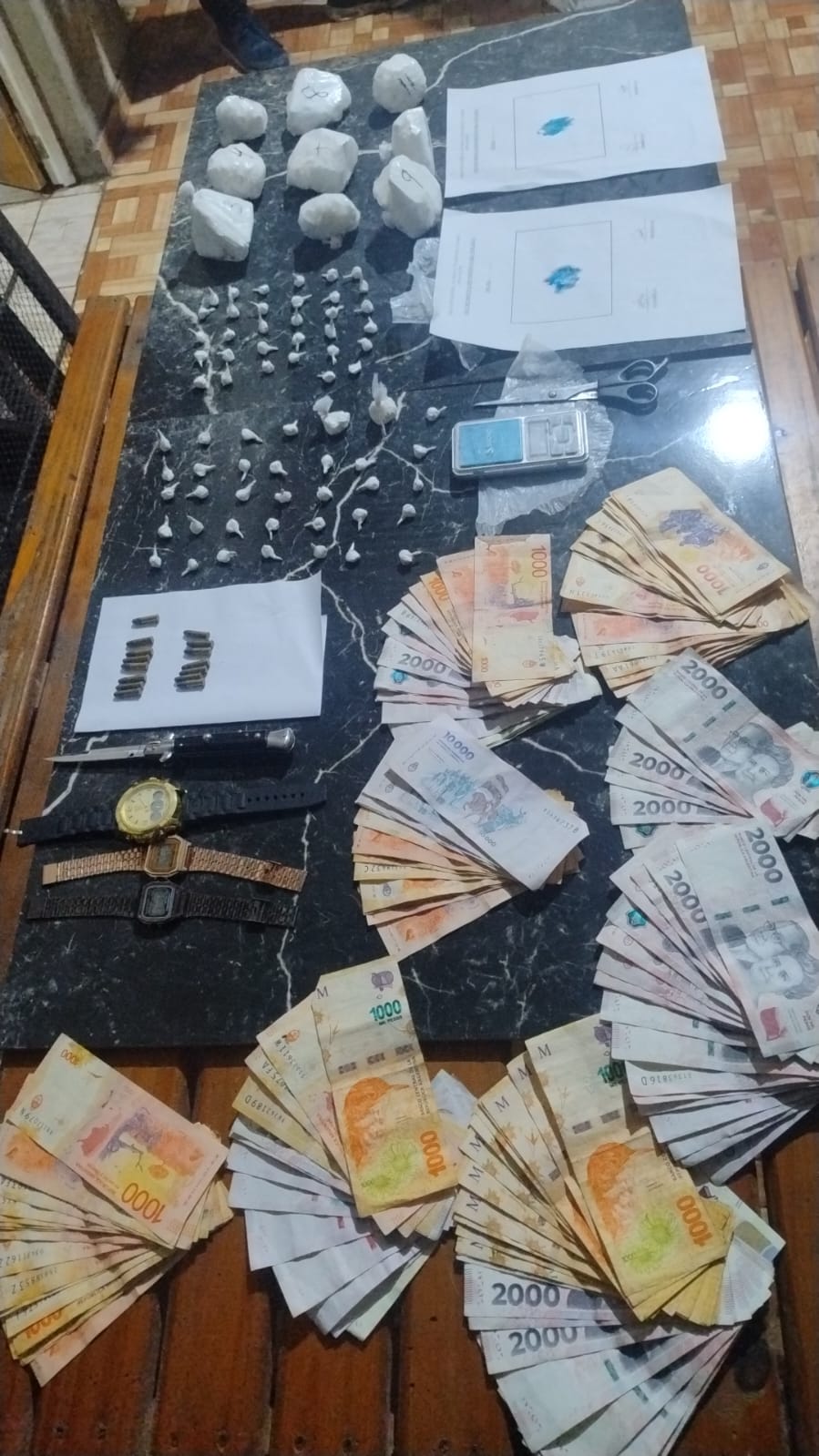 Posteriormente, en el otro domicilio, se secuestraron 92 dosis de cocaína de máxima pureza, con un peso de 46 gramos, 33 dosis de marihuana de máxima pureza (45 gramos), una bolsa con cogollos de marihuana (233 gramos), dinero en efectivo, elementos de corte, una balanza de precisión, once teléfonos celulares y un arma de fuego. En la oportunidad, se aprehendió a dos mujeres mayores de edad.