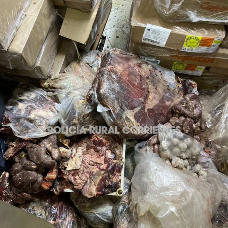 El propietario realizó la entrega voluntaria de la mercadería, procediéndose al secuestro de costillares, vacío, aguja, menudencias, cortes de cerdo, osobuco, pollo y chorizos, que en total superaban la tonelada y media.