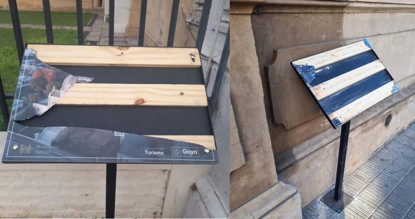 Atriles con información útil y descriptiva para los visitantes colocados en el frente de edificios de interés histórico, cultural y turístico de la ciudad de Goya aparecieron destruidos, en las últimas horas.