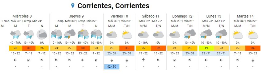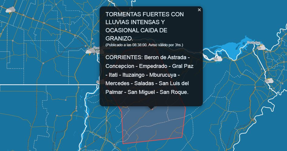 Por otro lado, se esperan tormentas fuertes con lluvias intensas y ocasional caída de granizo para toda la zona comprendida por Berón de Astrada, Concepción, Empedrado, General Paz, Itati, Ituzaingó, Mburucuyá, Mercedes, Saladas, San Luis del Palmar y San Roque.
