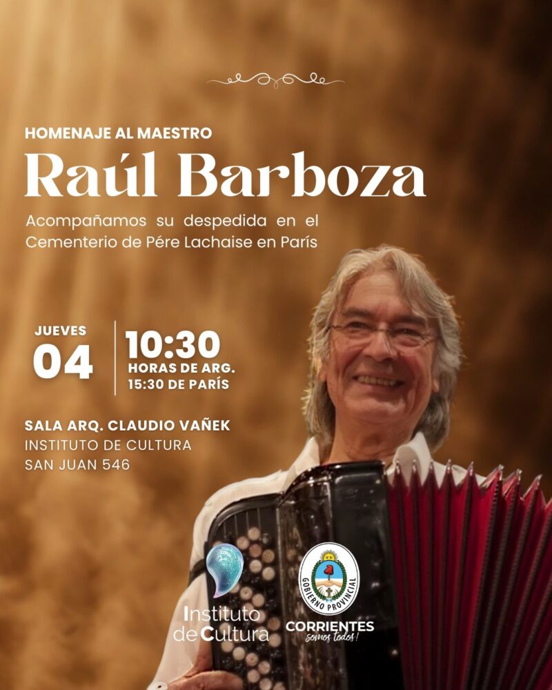 El Gobierno de la Provincia, a través del Instituto de Cultura de Corrientes, rendirá un sentido tributo a uno de los grandes embajadores del chamamé: el maestro Raúl Barboza. Este jueves a las 10,30, se realizará un homenaje al músico en la Sala Vañek (San Juan 546), acompañando simbólicamente la despedida a sus restos en Francia.