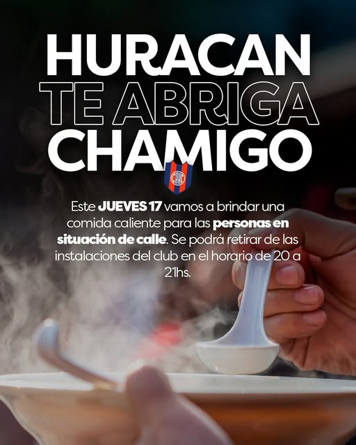 El club Huracán Corrientes expande su costado solidario con el lema, «Huracán te abriga, Chamigo». Los directivos del club del barrio Beron de Astrada volverán a brindar una comida caliente a las personas en situación de calle.