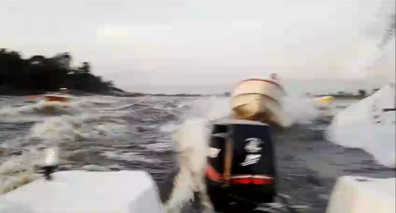 En las imágenes se puede ver como un pescador filma desde su embarcación la majestuosa largada de lanchas, cuando de repente otra embarcación se acercó a toda velocidad, los embistió y prácticamente los pasó por arriba.