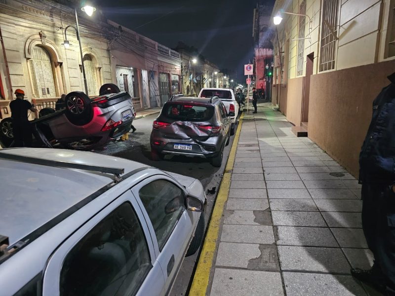 Un auto volcó en pleno microcentro correntino y dos personas quedaron atrapadas.