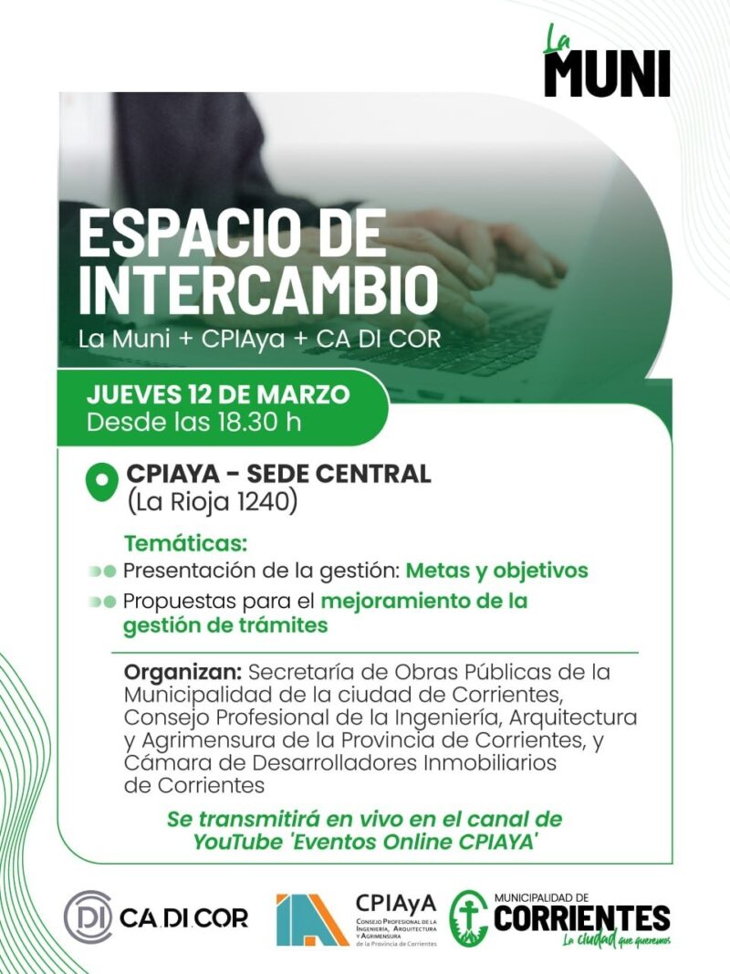 La Municipalidad de Corrientes realizará mañana una jornada de intercambio institucional junto al Consejo Profesional de la Ingeniería, Arquitectura y Agrimensura y la Cámara de Desarrolladores Inmobiliarios de Corrientes. Esto con el objetivo de fortalecer el diálogo entre el sector público y privado y avanzar en estrategias para el desarrollo urbano de la ciudad.
