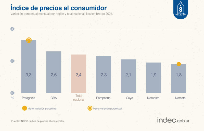 A escala nacional, el IPC fue del 2,4 por ciento en noviembre, acumulando una suba del 112 en lo que va de 2024 y del 166 en los últimos 12 meses.