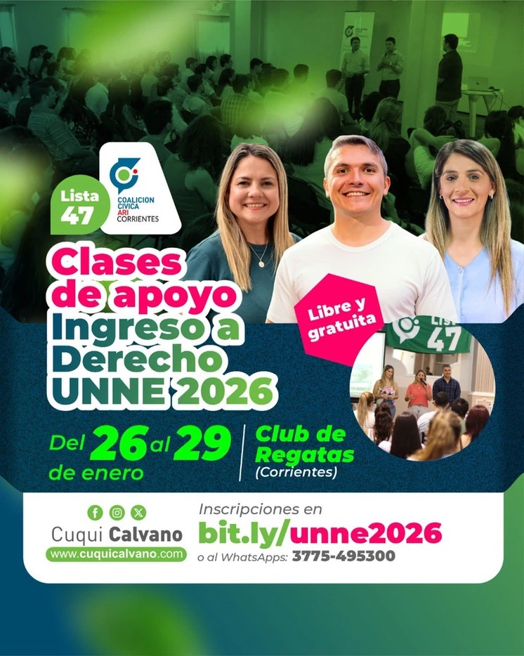 La Coalición Cívica ARI Corrientes anunció una nueva edición de las clases de apoyo para estudiantes ingresantes a la Facultad de Derecho de la Universidad Nacional del Nordeste (UNNE), una iniciativa que se desarrollará entre el lunes 26 y el jueves 29 de enero, en el Club de Regatas Corrientes.