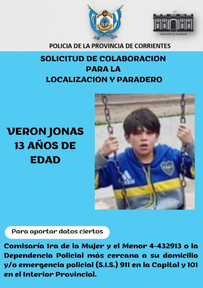En las últimas horas la Policía de Corrientes emitió una alerta para dar con el paradero de Jonás Verón, un niño de 13 años que se fugó del Hospital Pediátrico Juan Pablo II.