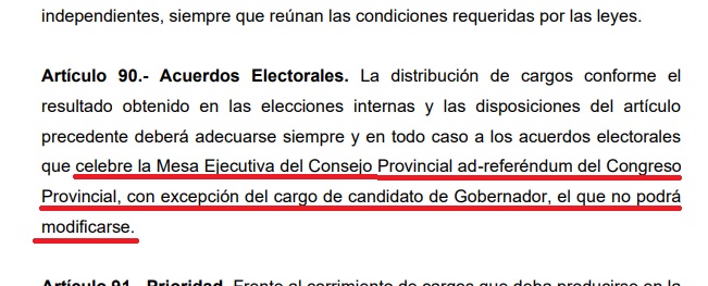 En esta carta orgánica (ver artículo 90), el Congreso está llamado a expedirse sobre la decisión de la mesa del Consejo respecto a alianzas electorales y corrimientos de candidatos. Una previsión que encierra una trampa gigantesca por cuando no está determinado que -la aprobación o rechazo- sea previa. La autorización que se le otorga a la mesa del Consejo es «un cheque en blanco» porque, si bien establece que sus decisiones serán «ad referéndum del Congreso», no especifica -como debiera- que ello debiera ser previa como condición de su validez.
