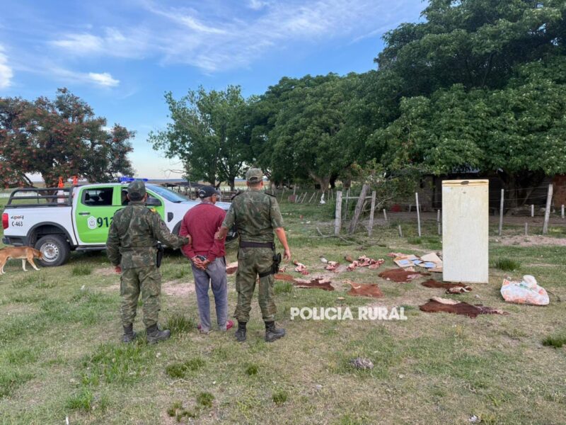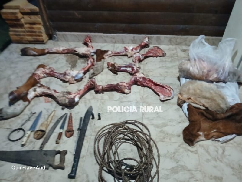 De acuerdo con la información que emitieron, con intervención del Fiscal Rural Dr. Luciano Bordón y por orden del Juez de Garantías Dr. Jorge Vallejos, se allanó una vivienda, ubicada cerca del lugar del hecho, donde se secuestró carne vacuna, restos óseos, herramientas de faena, cartuchos calibre 12.70, trozos de cuero y un celular.