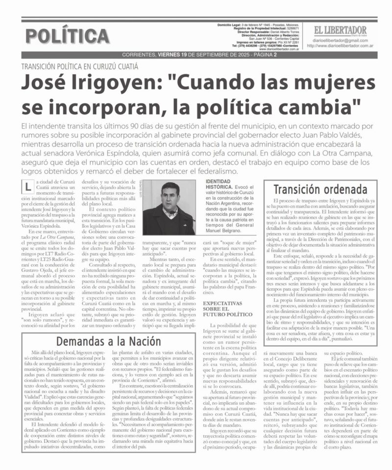 El contexto político provincial agrega matices a esta transición. En los pasillos legislativos y en la Casa de Gobierno circulan versiones sobre una convocatoria de parte del gobernador electo Juan Pablo Valdés para que Irigoyen integre su equipo.