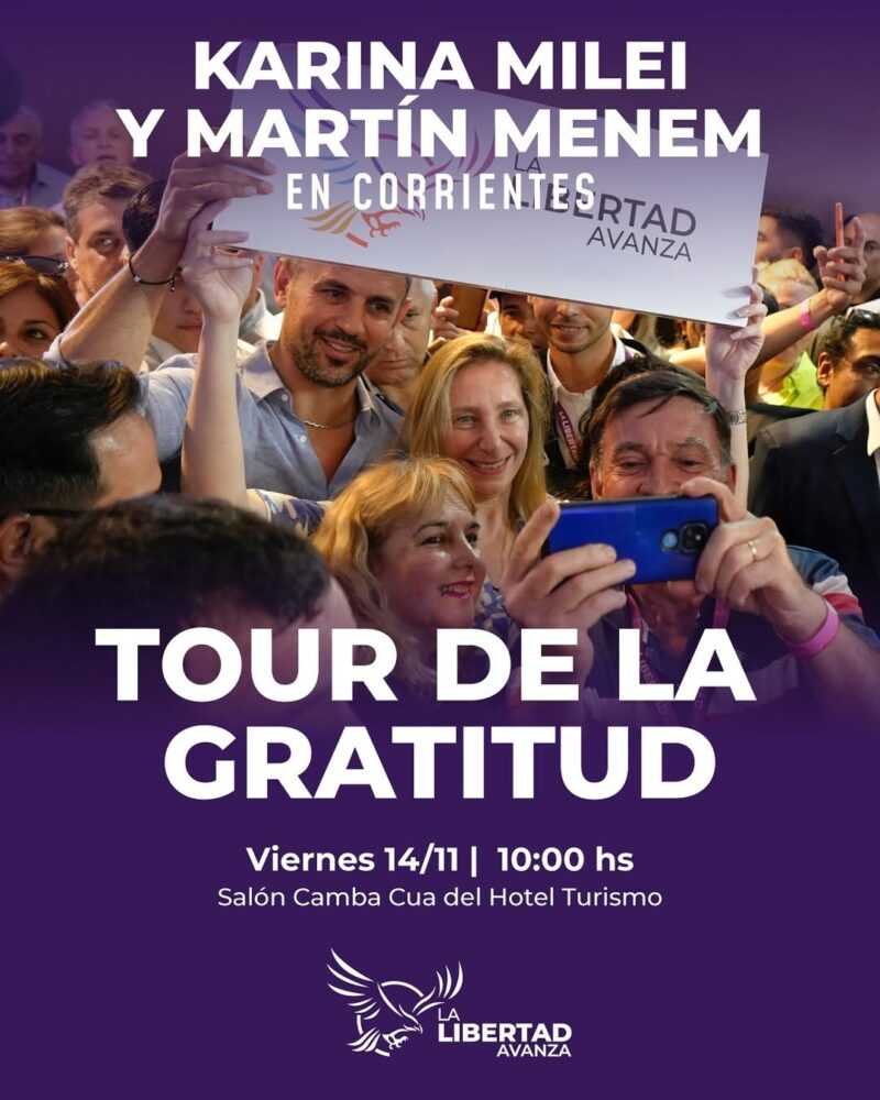 “Se trata de un acto que tiende a contar la Argentina que viene y un agradecimiento a la gente que trabajo para que el proyecto de la Libertad Avanza sea importante en Corrientes”, indicaron desde la organización.
