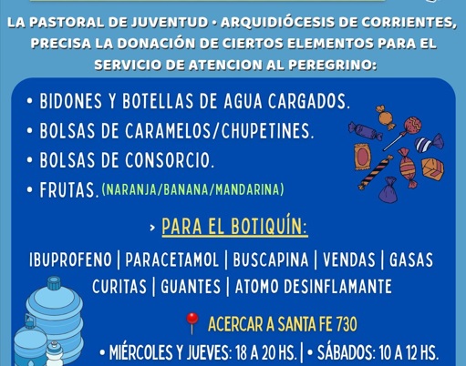 Seamos todos peregrinos de esperanza: La Pastoral de Juventud de la Arquidiócesis de Corrientes hizo un llamado urgente a parroquias, movimientos y particulares para que contribuyan con donaciones esenciales. Para los móviles de auxilio, se necesitan medicamentos básicos como ibuprofeno, paracetamol y buscapina, junto con insumos de primeros auxilios como gasas, curitas y guantes. Pero el apoyo no se detiene ahí.